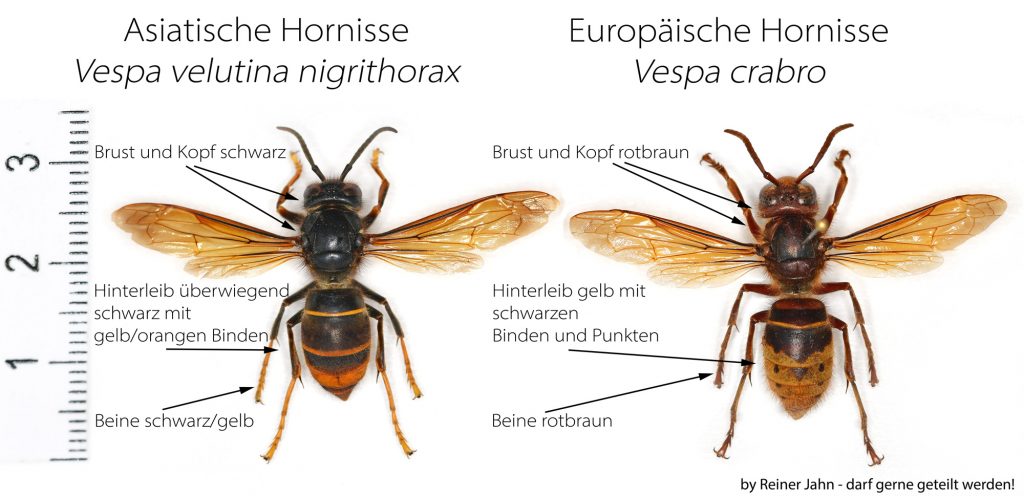 Die Unterschiede der beiden Hornissenarten sind mit ein bisschen Übung gut zu sehen:
